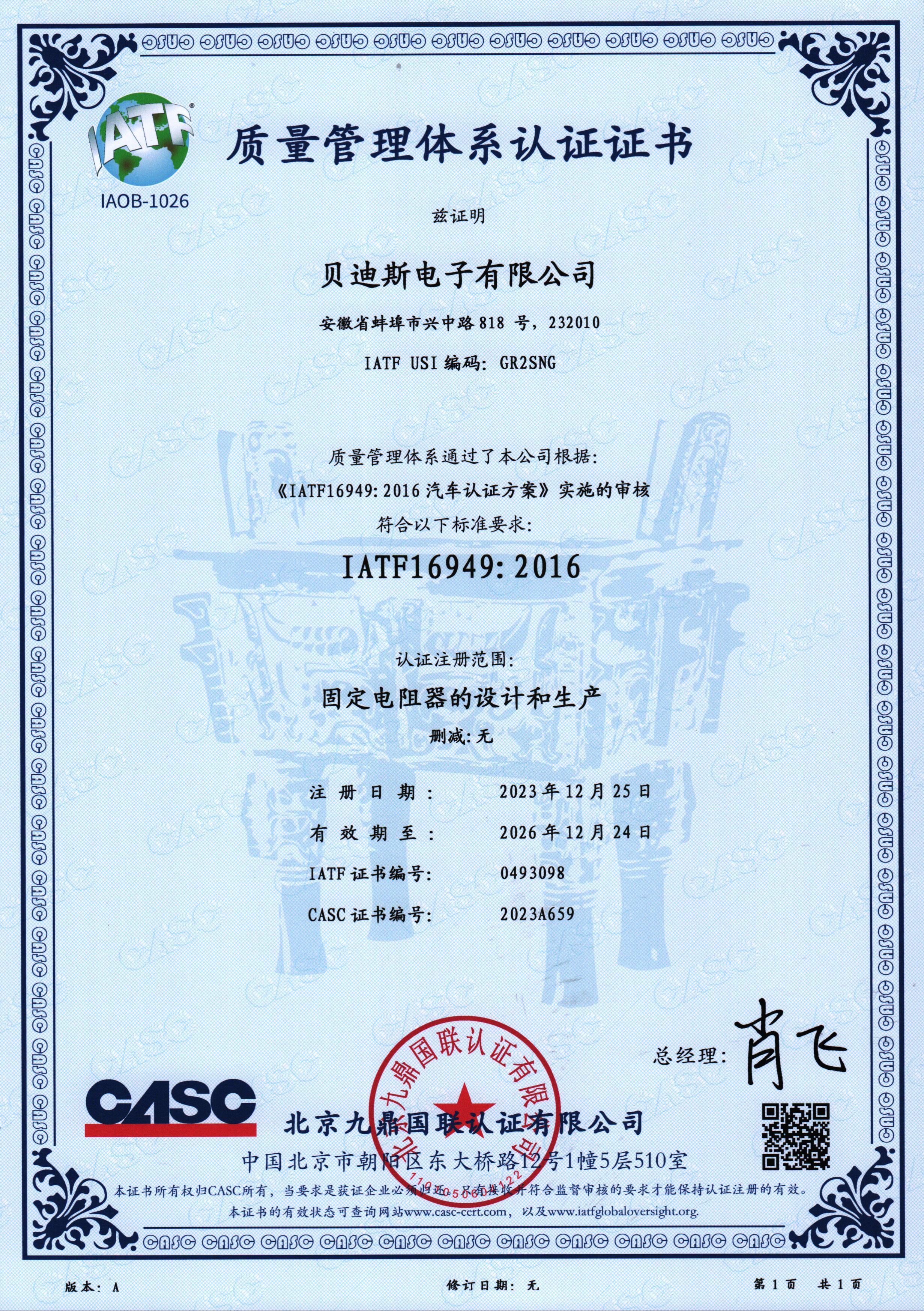 2023年12月25日贝迪斯电子有限公司顺利通过北京九鼎国联认证有限公司组织的IATF16949:2016质量管理体系认证审核,证书号(IATF证书编号0493098) 。